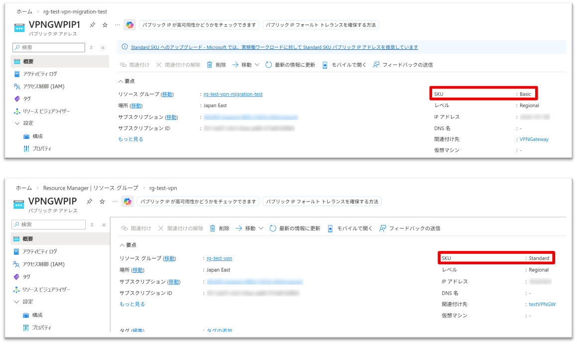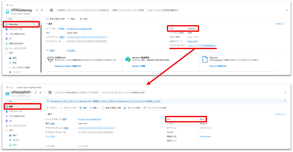 なお、SKU を変更しても、VPN Gatewayで使用されている Public IP アドレス自体は変更されませんのでご安心ください。