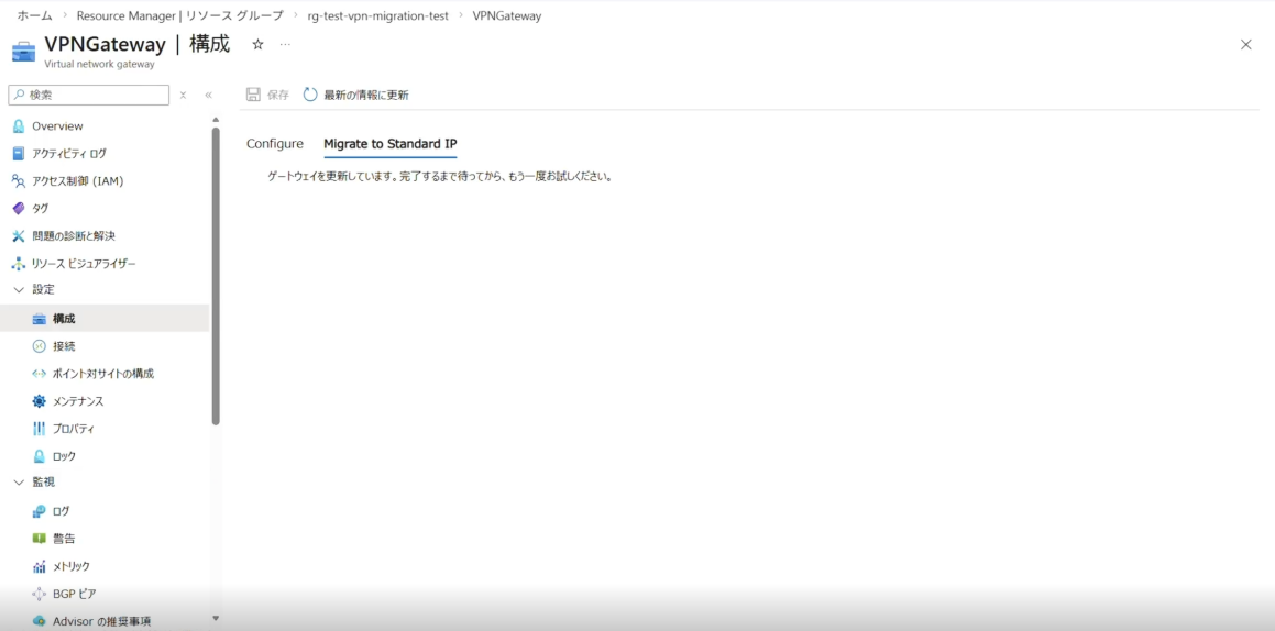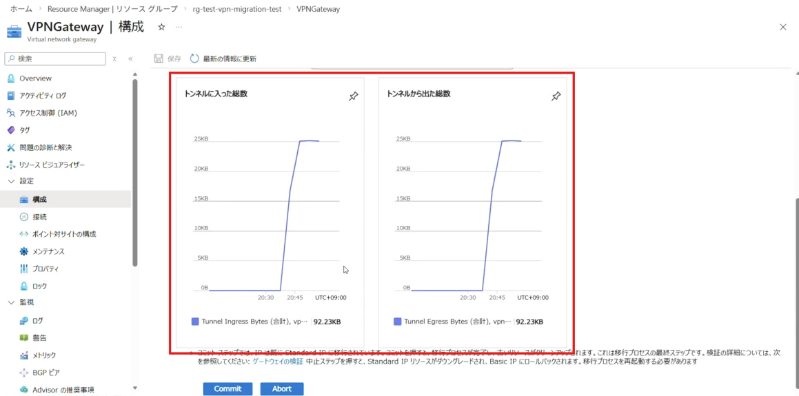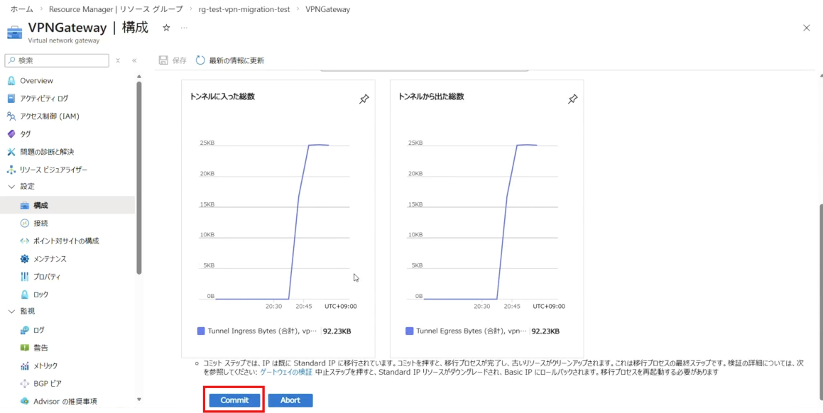 [Commit]が完了すると、VPN Gatewayで使用されている Public IP アドレスの SKU が Standard に変更され、マイグレーション作業は完了となります。