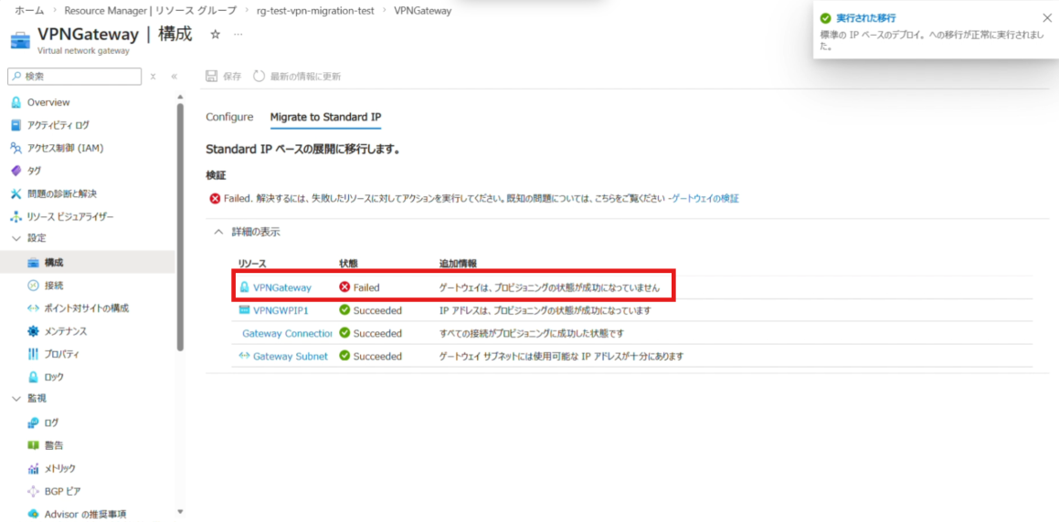 ※移行を行っている途中で VPNGateway の状態が Failed で表示されることがございますが、完了時には Succeeded に変わりますのでご安心ください。