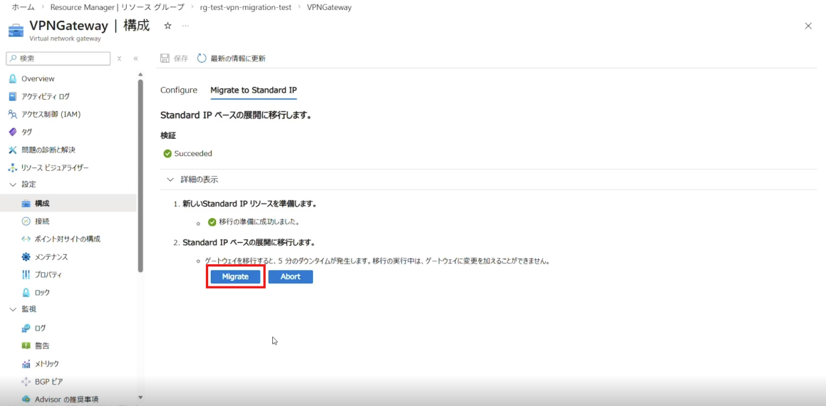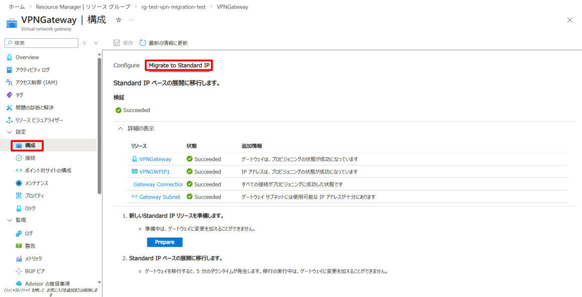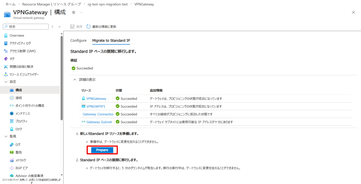 次に[Prepare]をクリックすると、マイグレーションの準備が開始され、移行先の VPN Gatewayが作成されます。