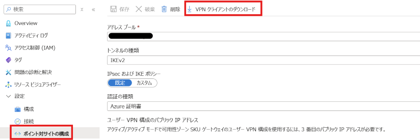 なお、P2S 接続に “cloudapp.net” で終わる FQDN を使用して VPN Gatewayへ接続されている場合は、準備完了後に [VPN クライアントのダウンロード] を選択し、