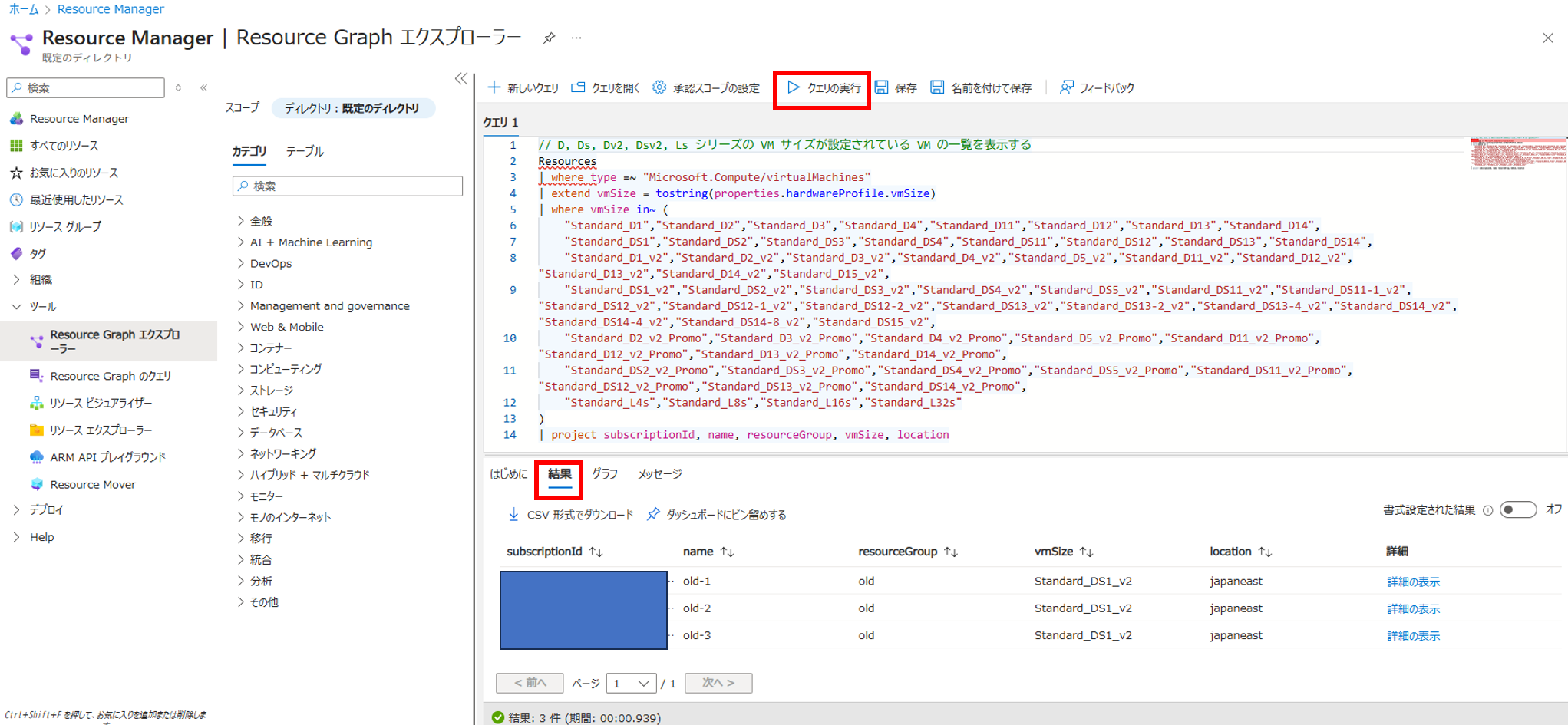表示された画面にてクエリを実行します。 まずは、検証として全ての VM の一覧表示が可能か確認することを推奨いたします。