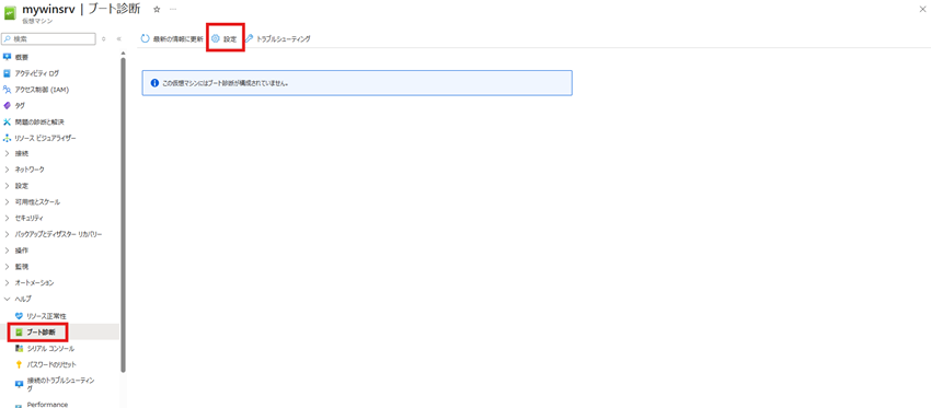 - ブート診断を有効化する Azure VM のページより、左側 [ヘルプ] – [ブート診断] を選択します。