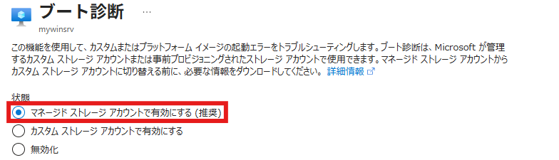 ブート診断では、お客様管理のストレージ アカウント (カスタム ストレージアカウント アカウント) を指定し、利用することも可能です。
